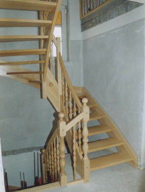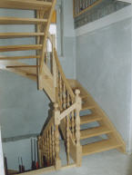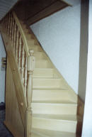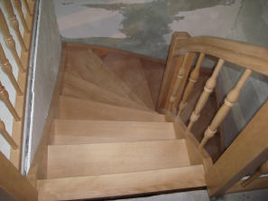 halbgewendelte Holzwangentreppe