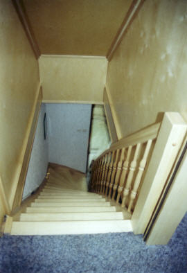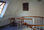 viertelgewendelte Holzwangentreppe mit Setzstufen, Treppeneingang verkleidet, Treppenbereich im Dachgeschoss verkleidet