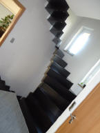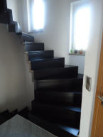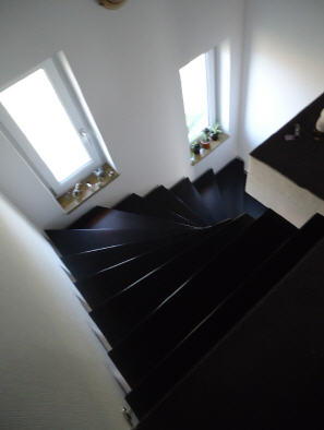 Bolzentreppe in Faltwerkoptik, dunkel gebeizt und lackiert